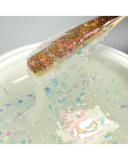 • nuanță alb sidefată îmbogățită cu sclipici fin și paiete cu irizații cu note aurii, turcoaz și portocaliu