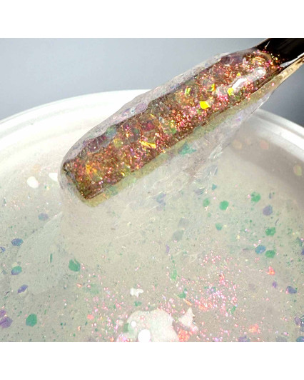 • nuanță alb sidefată îmbogățită cu sclipici fin și paiete cu irizații cu note aurii, turcoaz și violet;